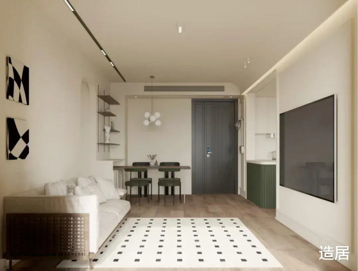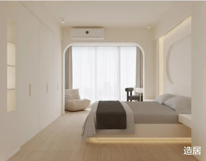 柜门选平板无拉手设计,搭配反弹器,开门不占空间,视觉上更显轻薄,颜色建议选浅灰、米白等浅色系,能让小空间更通透。