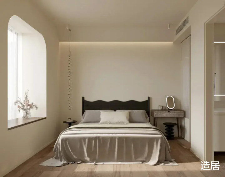 大卧室的床头,用轻薄款家具+床底利用的布局。选极简床头柜,只有一个抽屉那种,专门放睡前要用的护肤品、眼罩,台面只留一盏小台灯,视觉上很清爽。