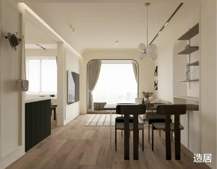 先解决“临时杂物没处放”的问题,餐桌布局时,结合空间面积,可以放一个40cm深的窄款成品餐边柜,做“上开放下封闭”。