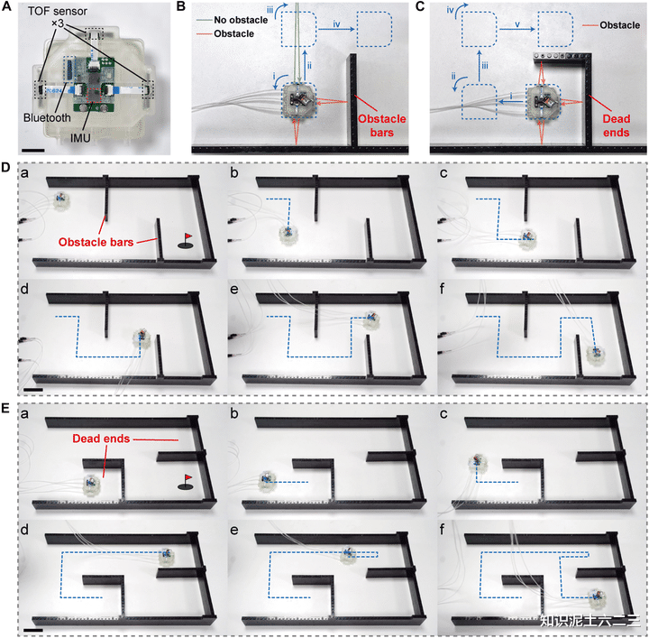 机器人搭载定制化微型 PCB,集成蓝牙模块、IMU 和 3 个飞行时间(TOF)传感器,可实时监测周围环境距离(阈值 60mm)。在 S 形迷宫和死胡同场景中,机器人能通过 IMU 追踪航向,结合 TOF 传感器数据自主规划路径,完成转向、倒退、绕行等动作,无需人工干预即可抵达目标位置。