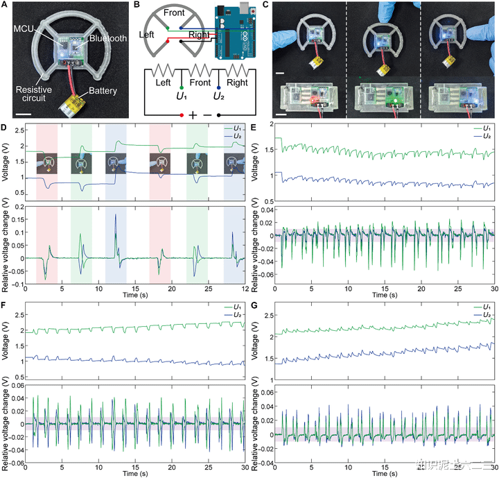 触觉 - 视觉反馈:碰一碰就 "说话" 设计 3/4 环形软传感器,通过 DIW 打印的电阻型硅胶构建传感电路,将传感器分为左、前、右三个检测区域。当某区域受到触碰时,电阻变化会转化为电压信号,经蓝牙模块传输至控制器,触发对应颜色的 LED 提示 —— 红色代表左侧触碰、绿色代表前方触碰、蓝色代表右侧触碰。经过 20 次循环变形测试,传感器响应稳定,阈值精度可达 ±0.01V。
