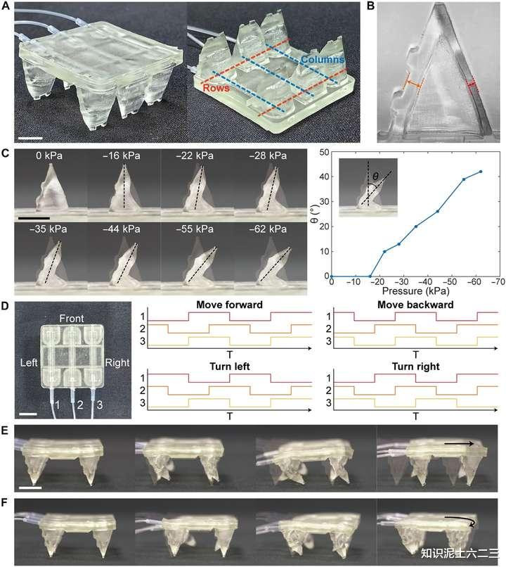 多模态运动:灵活走位无压力 软执行器采用 2 行 3 列的足部设计,每个足部是厚度不对称的三角形结构(左壁 1.1mm、右壁 0.8mm),通过独立控制 3 个气动通道的负压信号,可实现前进、后退、左右转向等运动。当施加 - 62kPa 负压时,足部弯曲角度可达 45°,通过调控通道驱动时序,机器人能在平面自由移动。