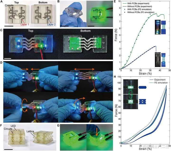 抗变形结构设计:通过晶格超材料、波浪形互连件和离散化 PCB 三大设计,让机器人在拉伸、压缩、扭转等大变形下仍保持机电稳定。离散化 PCB 减少应力集中,波浪形电路提升柔性,晶格结构可缓冲冲击,即使承受 40% 应变,内置 LED 电路仍能正常发光。