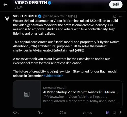 Video Rebirth希望构建面向AI视频生成的“世界模型”。该公司于2024年10月成立,总部位于新加坡,计划于今年12月推出首款正式产品“Bach”模型,并将重心从消费级工具转向广告、电商、影视与动画等专业创作领域,提供具备高保真度、可控性与物理一致性的生成式视频解决方案。
