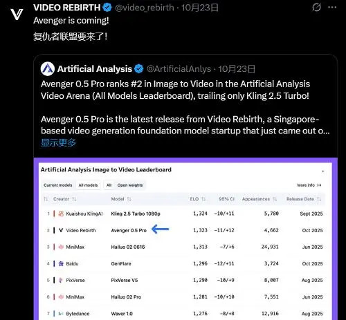 10月,Video Rebirth曾发布一款名为Avenger 0.5 Pro的模型,并在Artificial Analysis的视频竞技场上拿下总榜第二的排名,仅次于可灵2.5 Turbo。