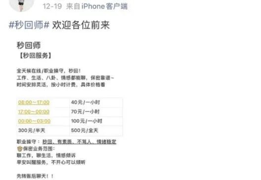 秒回师的核心业务,是在指定时段内为客户提供微信、电话、视频等即时回应服务,扮演倾听者的角色。不同于传统客服的标准化回复,他们的服务核心是情感价值的精准供给。